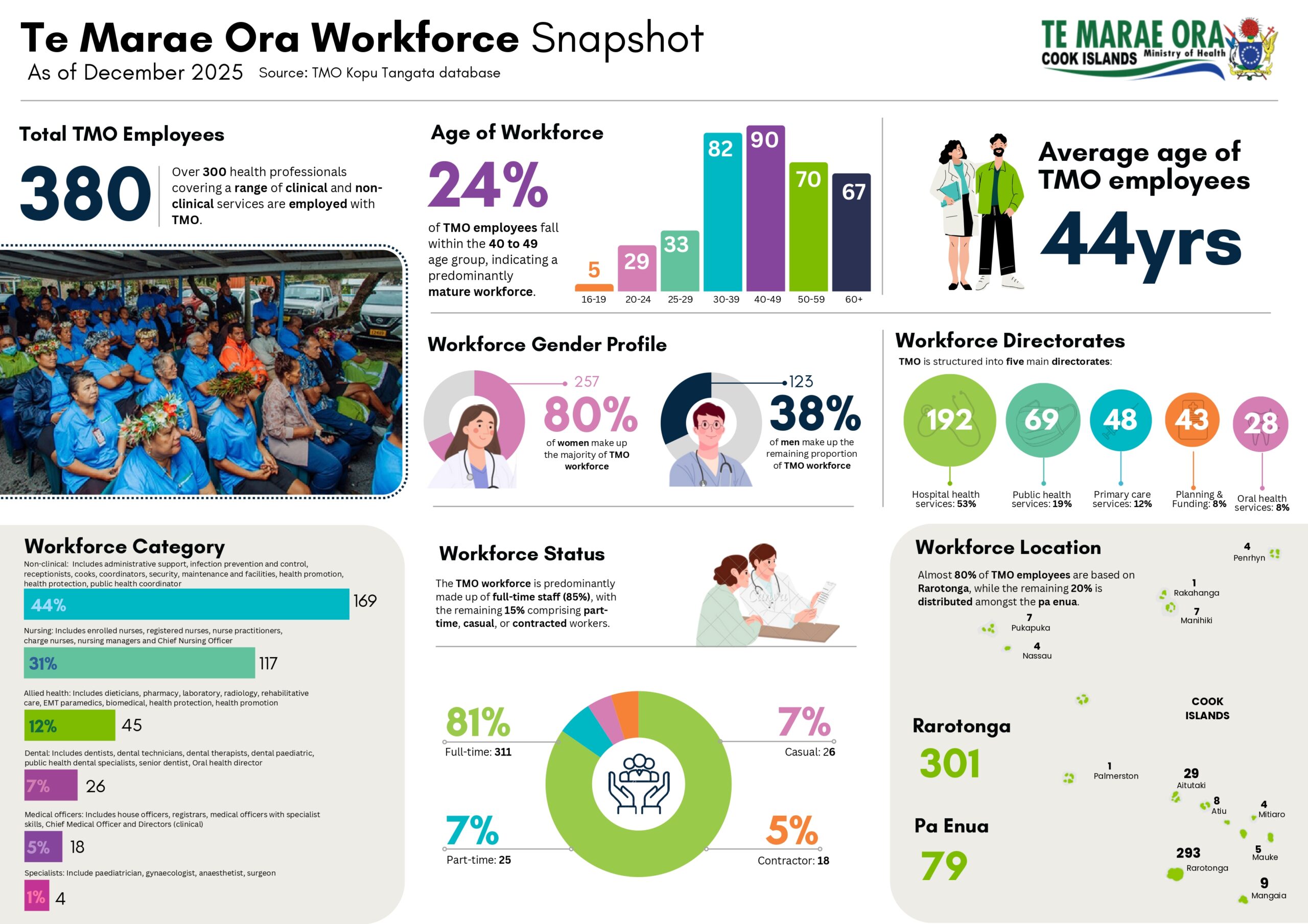 Te Marae Ora is the main employer of health professionals in the Cook Islands. The health workforce is the public ‘face’ of the health sector and as such needs to reflect population health needs and demand for health services. Over 300 health professionals covering a range of clinical and non-clinical services are employed with Te Marae Ora – of which 79% are based on Rarotonga.